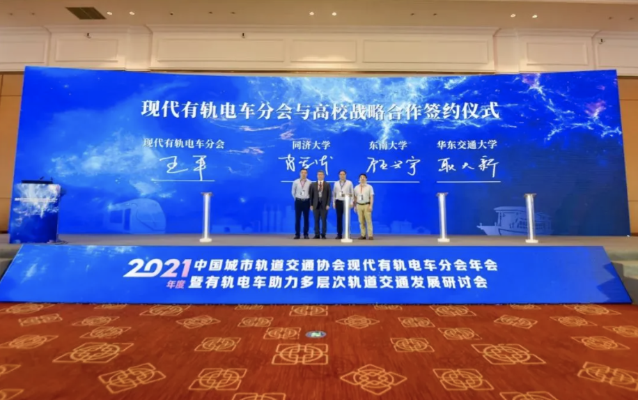 中國城市軌道交通協會現代有軌電車分會秘書長韓建良介紹會議情況及到訪嘉賓,并作分會2020年年度工作報告及2021年計劃;中國城市軌道交通協會現代有軌電車分會會長王平、中國城市軌道交通協會副秘書長王雁平、嘉興市委常委、常務副市長陳利眾分別致辭。現代有軌電車分會王平會長代表分會與同濟大學、東南大學、華東交通大學等高校代表簽訂戰略合作協議。