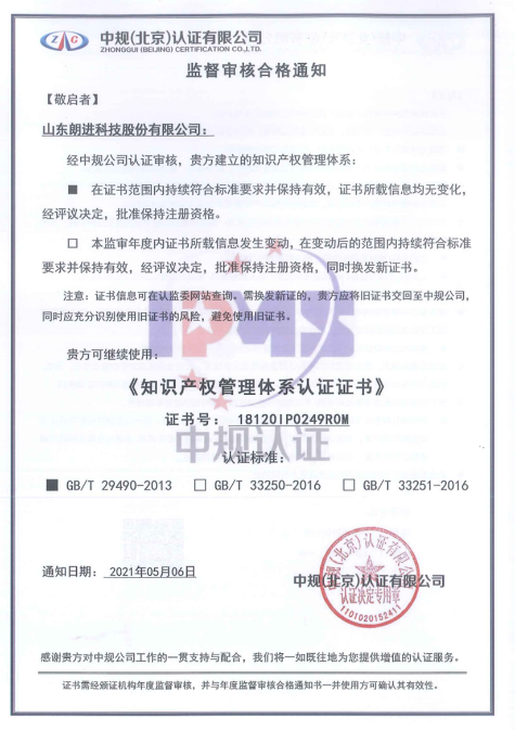 2021年5月6日,朗進科技收到中規(北京)認證有限公司簽發的《監督審核合格通知書》,批準公司知識產權管理體系保持認證證書注冊資格。這標志著公司知識產權體系管理經過一年的運行,符合體系管理的規范化要求,通過體系審核認證。