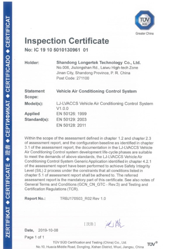 作為一種重要的公共交通工具,軌道車輛的安全性和可靠性一直得到廣泛關(guān)注。為進(jìn)一步提升軌道車輛空調(diào)產(chǎn)品的安全性和可靠性,山東朗進(jìn)科技股份有限公司于2017年開始著手開展軌道空調(diào)產(chǎn)品SIL2安全等級的認(rèn)證工作,經(jīng)過兩年的持續(xù)提升和改進(jìn),于2019年10月8日順利通過SIL2安全等級認(rèn)證。
