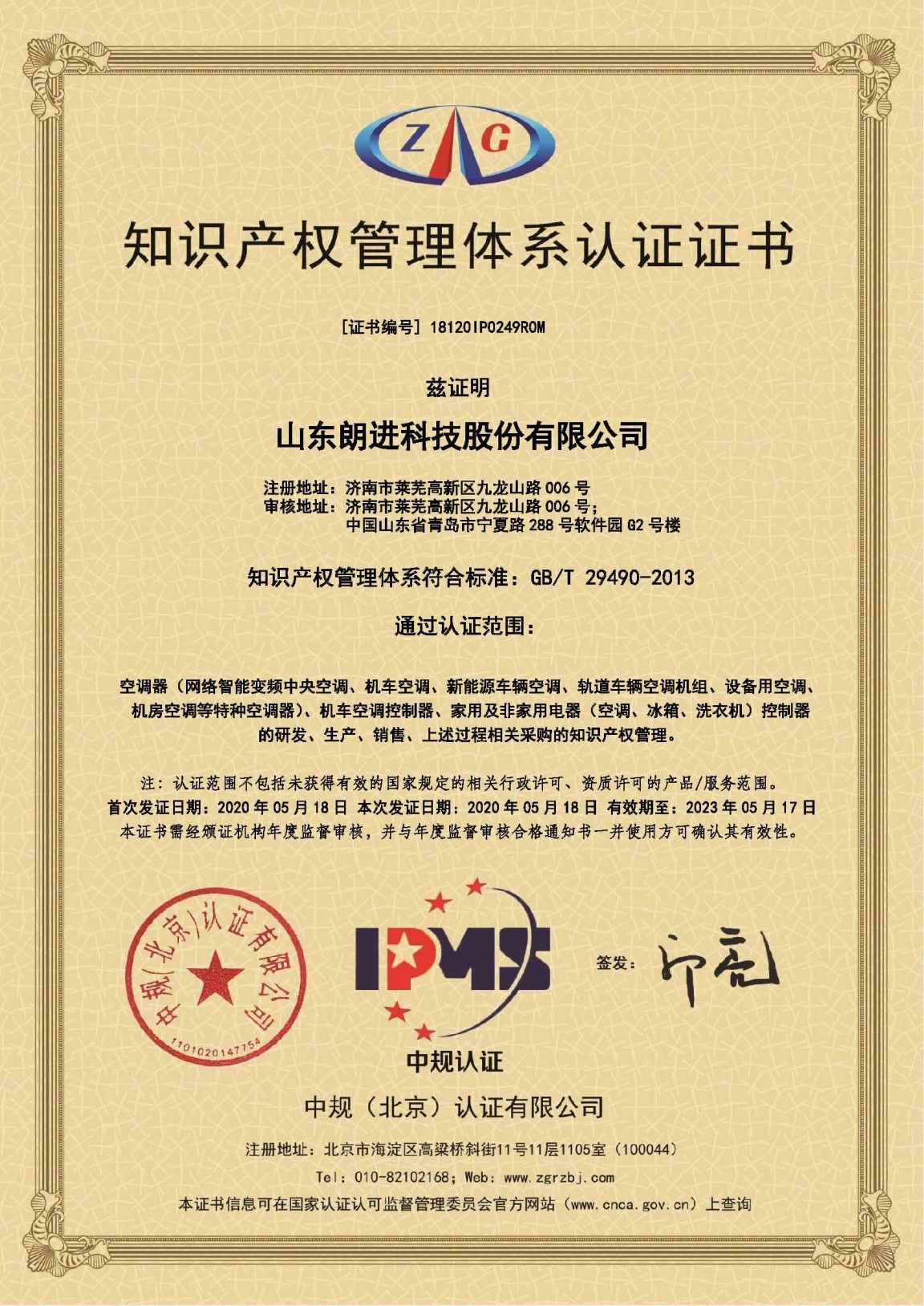 朗進(jìn)科技于2020年05月18日正式獲得中規(guī)(北京)認(rèn)證有限公司頒發(fā)的《知識(shí)產(chǎn)權(quán)管理體系認(rèn)證證書》(證書編號(hào):18120IP0249R0M)。