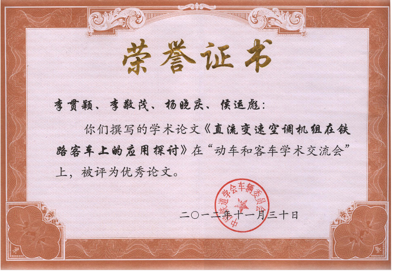 在中國鐵道學會車輛委員會動車、客車學術交流會優秀論文評選活動中,我公司《直流變速空調機組在鐵路客車上的應用探討》被評選為優秀論文.