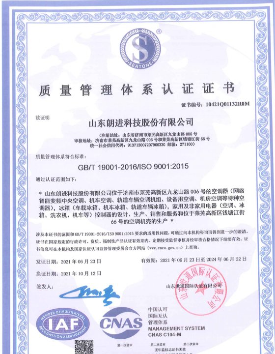 朗進(jìn)科技ISO9001質(zhì)量管理體系認(rèn)證
